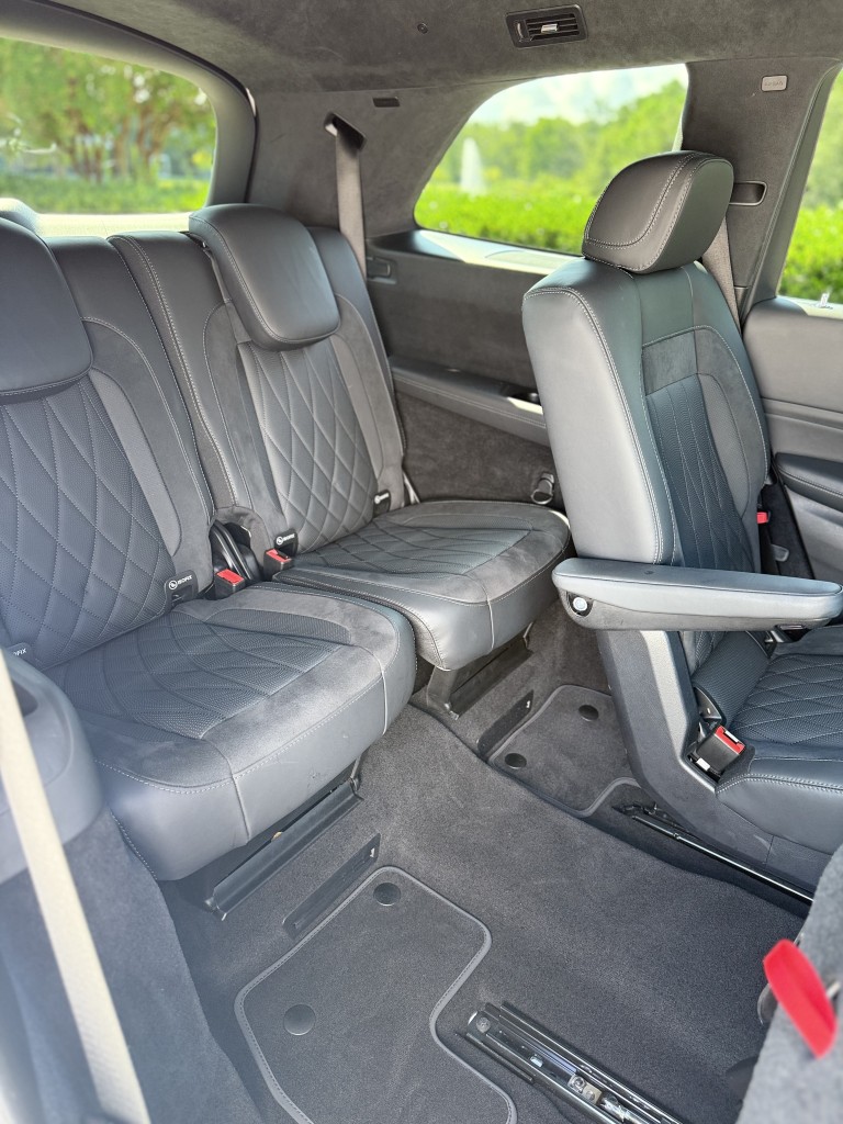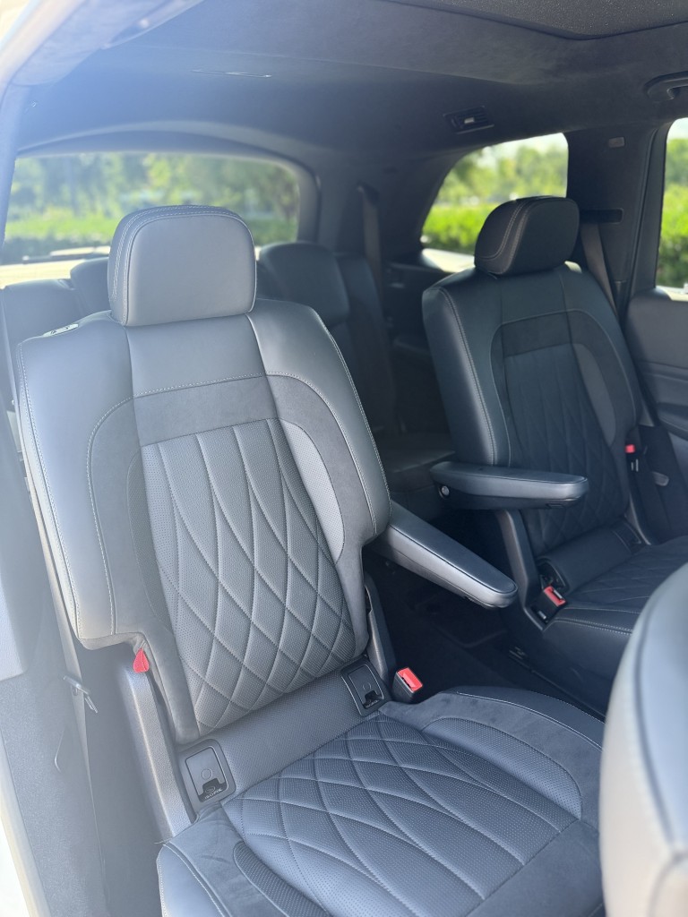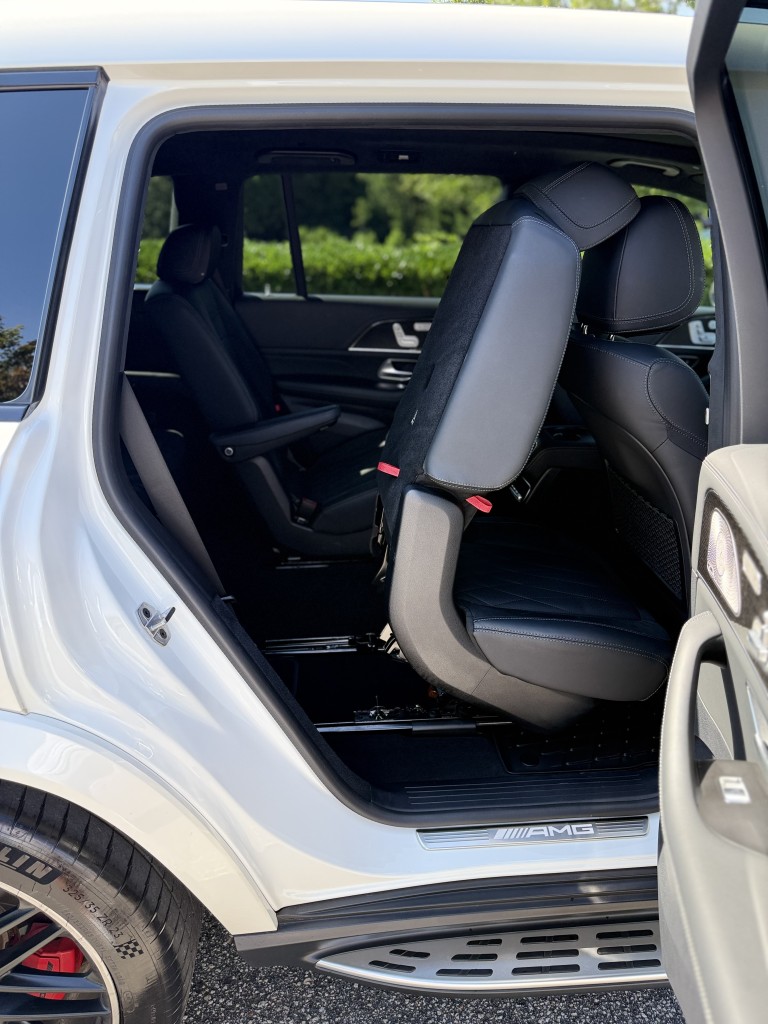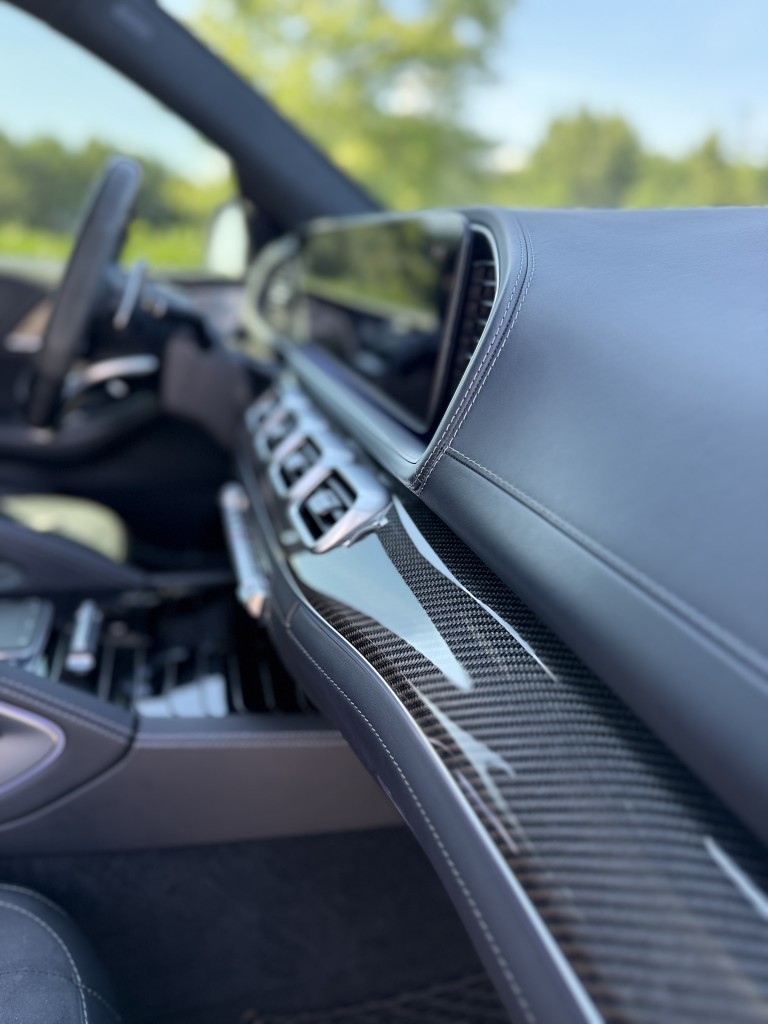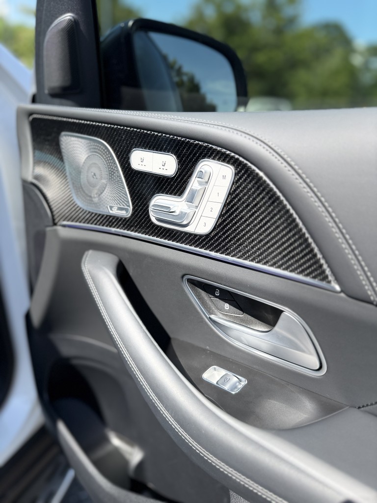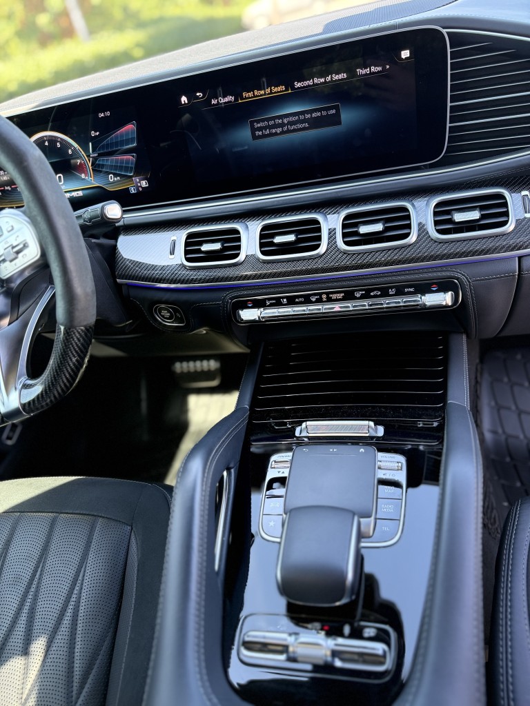 Factory-equipped with the AMG Carbon Fiber Interior Package, the cabin features carbon fiber door panels, dash trim, and AMG performance steering wheel, giving the interior a rare, motorsport-inspired look. The layout includes second-row captain’s chairs and a third-row seat, making this a highly desirable and practical configuration.