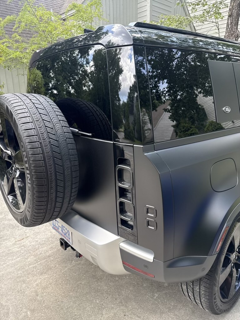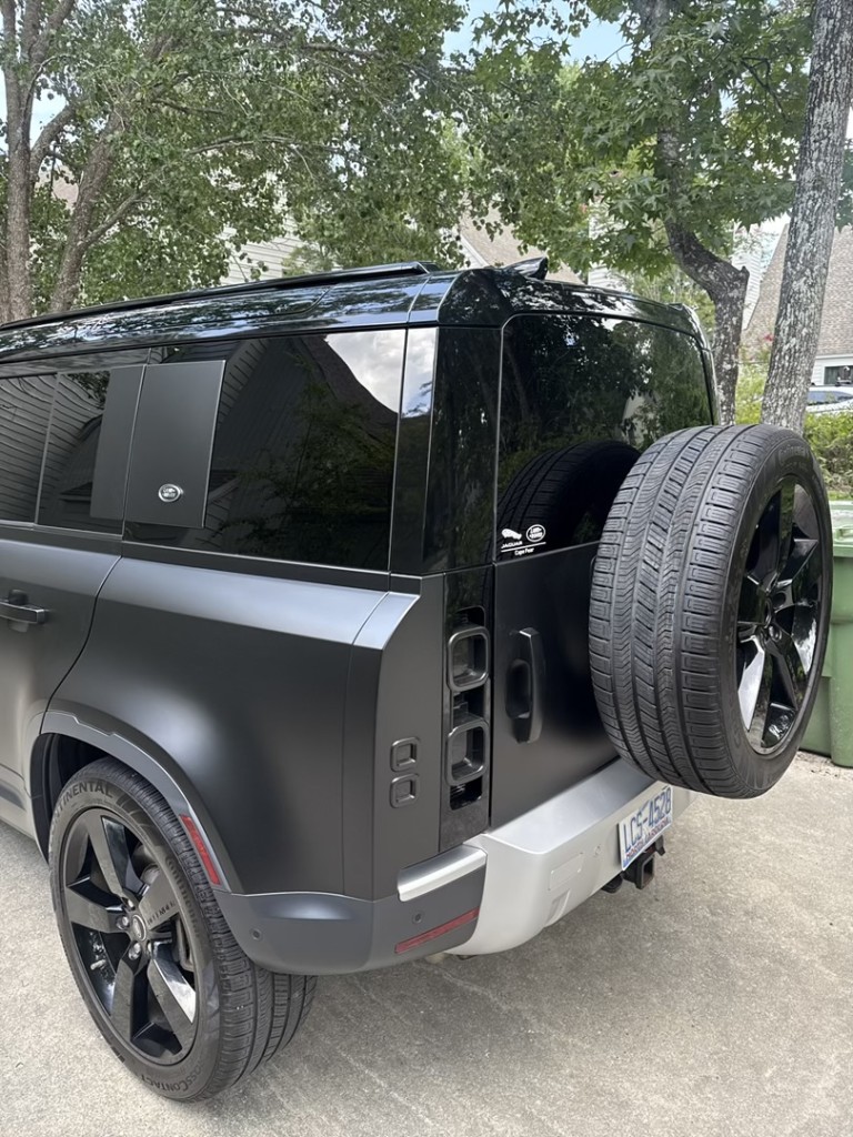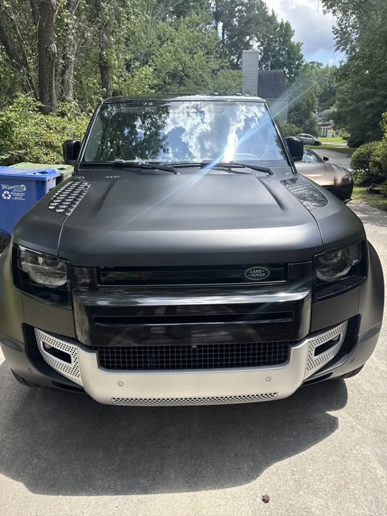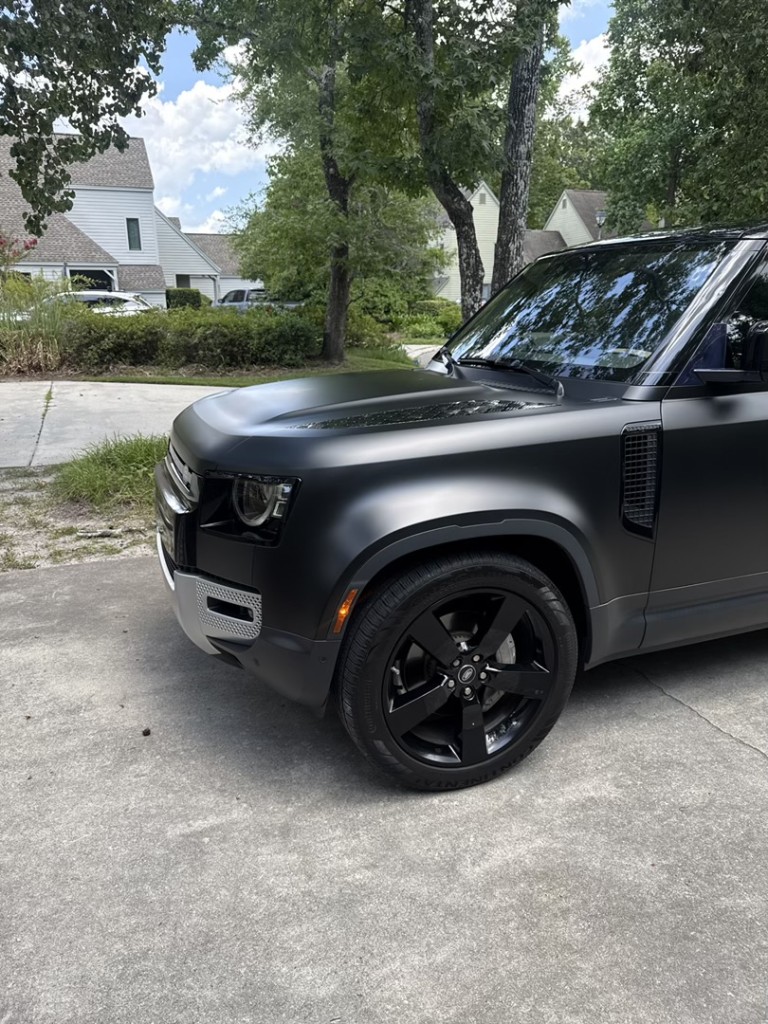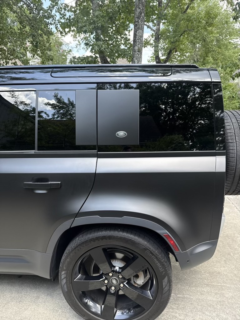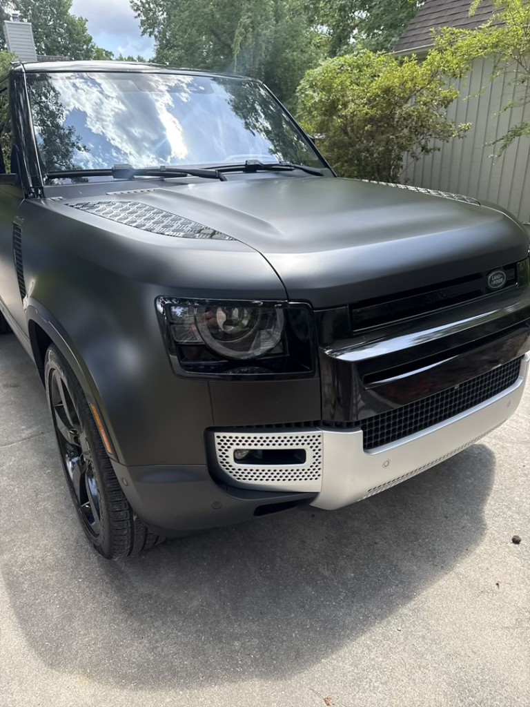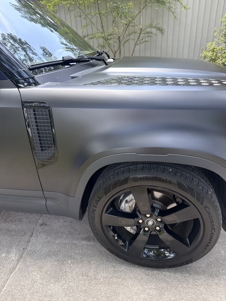 Finished in Pangea Green Metallic from the factory and professionally wrapped in matte black, the exterior has a bold, stealth look while preserving the original paint underneath. Riding on 22-inch wheels, it has a commanding stance that sets it apart from standard Defenders.
